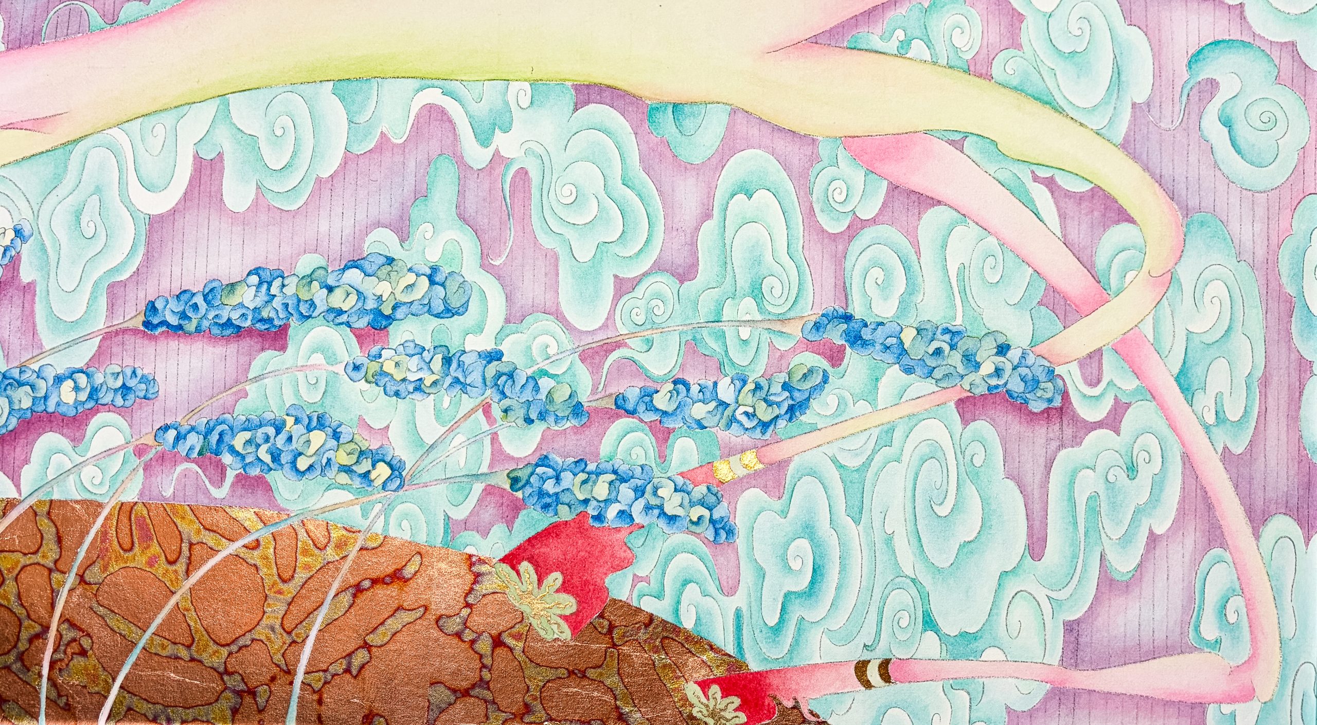 許頌靈生於 1999 年,現生活和工作於香港,2023年畢業於香港浸會大學視覺藝術院視覺藝術系文學士。許氏將鮮豔的色彩和奇幻的圖像融入傳統水墨和陶瓷作品上,呈現出新水墨與跨媒介混用的風貌。許氏其具有神秘感和吸引力的作品引領觀眾思考能量流動和畫面背後的創作過程。她細膩筆觸下創出的神秘地景及奇幻構圖,象徵宇宙間的相互聯繫及其無窮無盡的可能性。