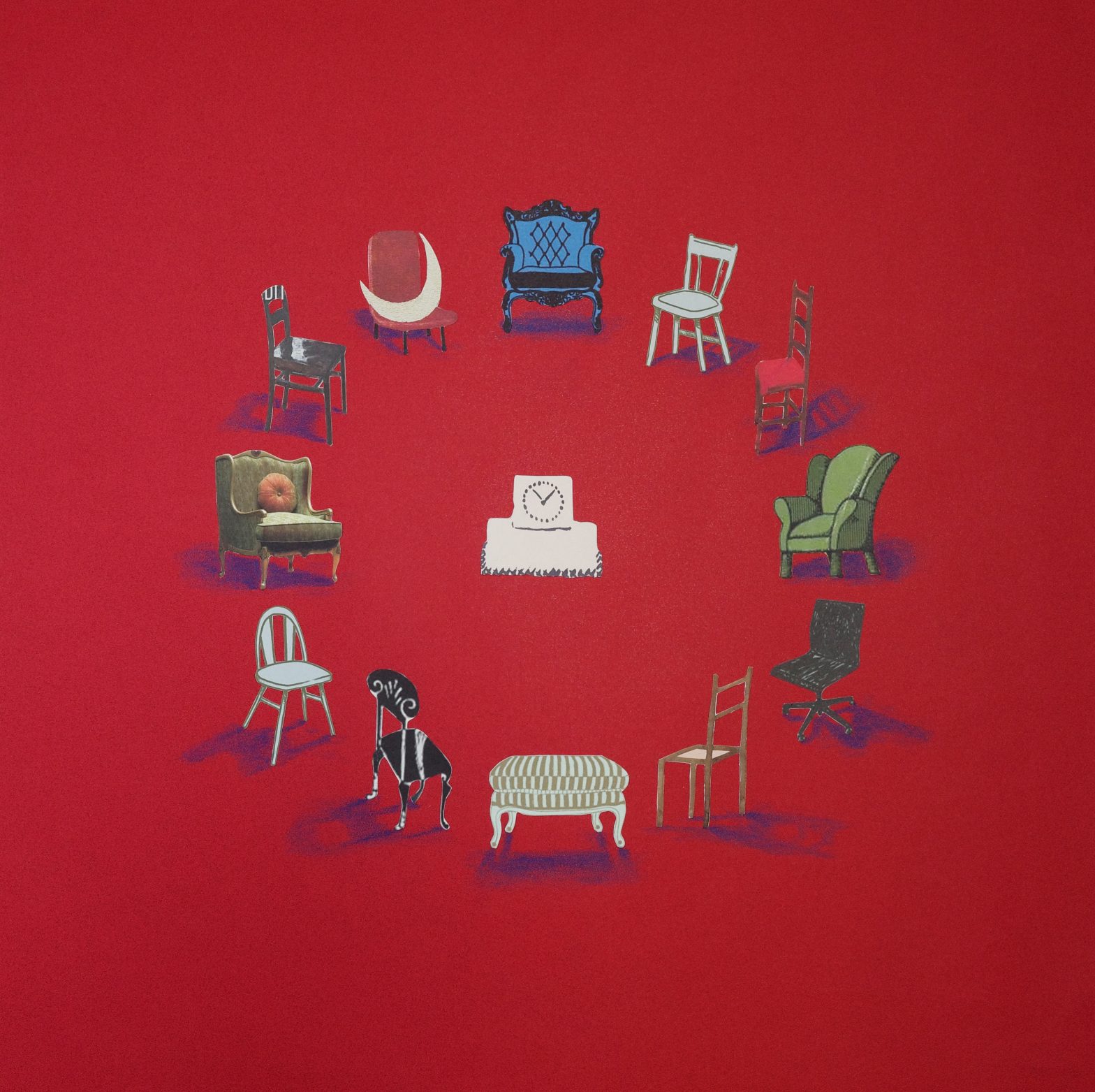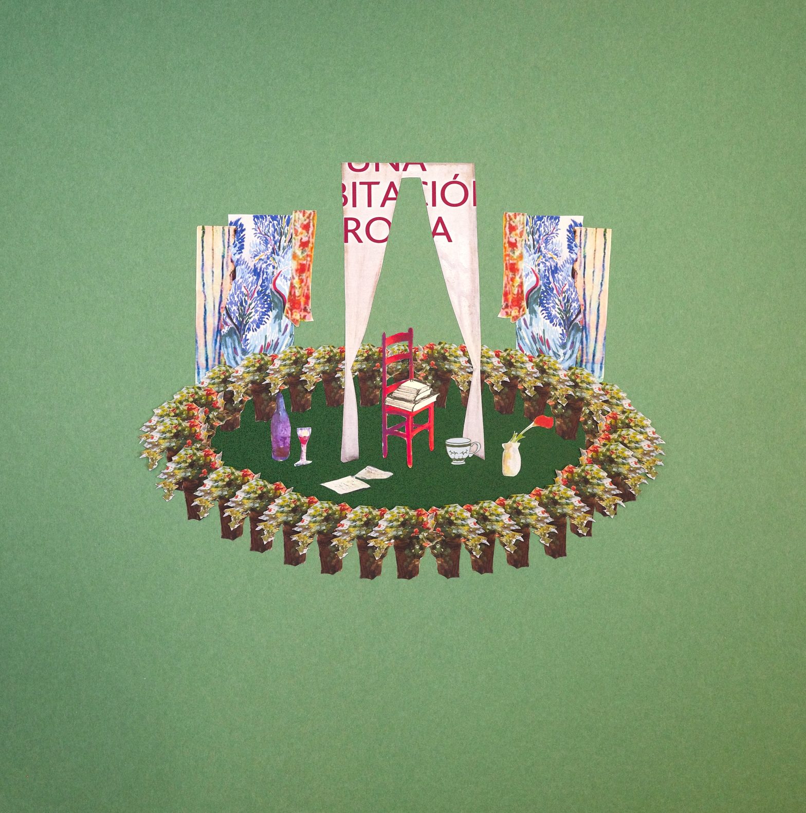 Lam’s exploration of “room” expands beyond video into the creation of graphic collage. Using A “Room of One’s Own” as a visual material, she collects visual representations of women’s rooms found on the covers of various editions of the book, extracting and reorganizing the recurring motifs of domestic still life—chairs, tables, vases, windows—to generate into a sequence of five paper collage pieces. Through the shift in medium, she not only transcends the imaginary and constructive dimensions of her work but also visually layers literary narrative, cultural symbols, and personal interpretation, creating a multi-layered dialogue of space.